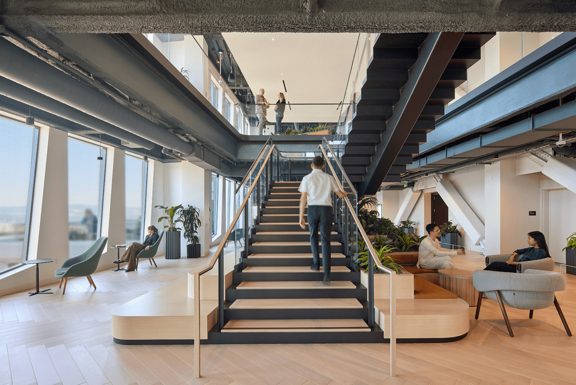 Centrally placed between the elevator banks, adjacent to reception above and the Commons below, the custom stair uses clear proportions and sightlines to invite use and keep orientation intuitive. Architects, designers and builders considered every detail—handrails, materials, biophilia—to transform utility into sculpture.
