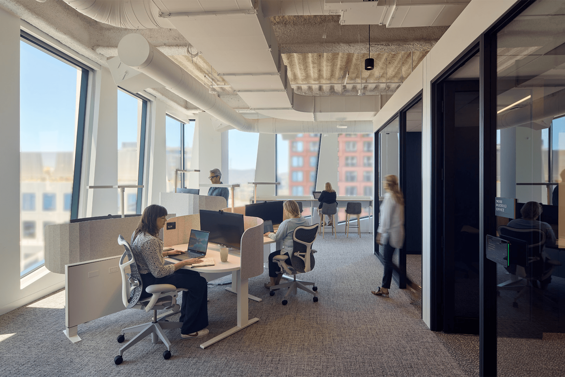Neighborhoods, which each support 32-40 people, have huddle rooms, paired focus booths, a project table, personal lockers and a support zone all within a two-minute walk. A flexible kit of parts—including demountable partitions and monitor-mounted lighting—creates a stable framework that can flex without renovation. Workstations break the grid as four-desk pinwheels that eliminate middle seats. Monitors mount on arms, and lighting mounts to monitor stands. Layouts change, but the neighborhood DNA remains intact.