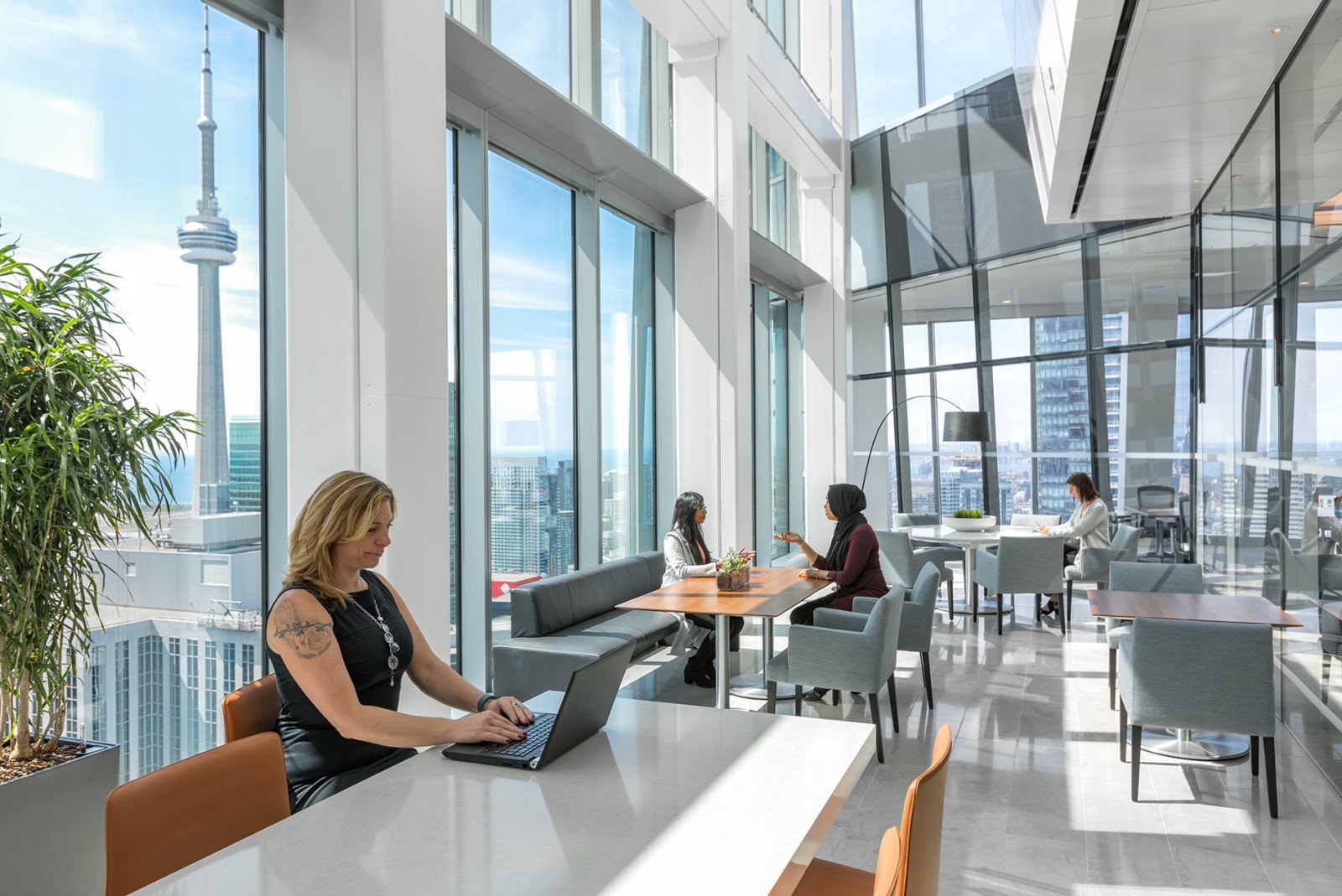 Floor-to-ceiling windows offer spectacular 360-degree views of Toronto and beyond. Complemented by clerestories and skylights, the glass curtain wall draws in daylight, illuminating the wood, leather, cool limestone and soft furnishings found within the Centre’s innovation lab, high-tech boardrooms, collaborative meeting areas and vibrant events space.