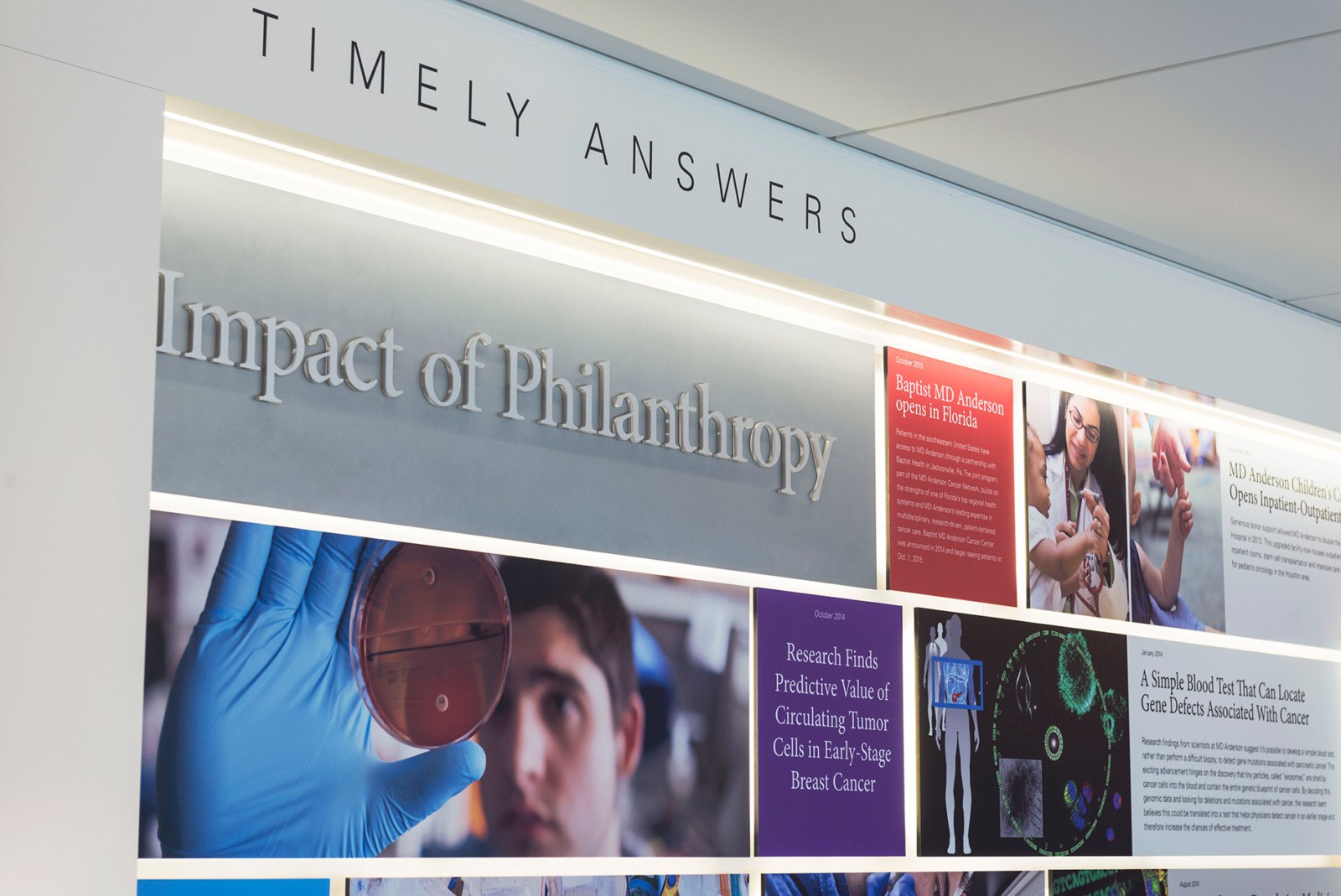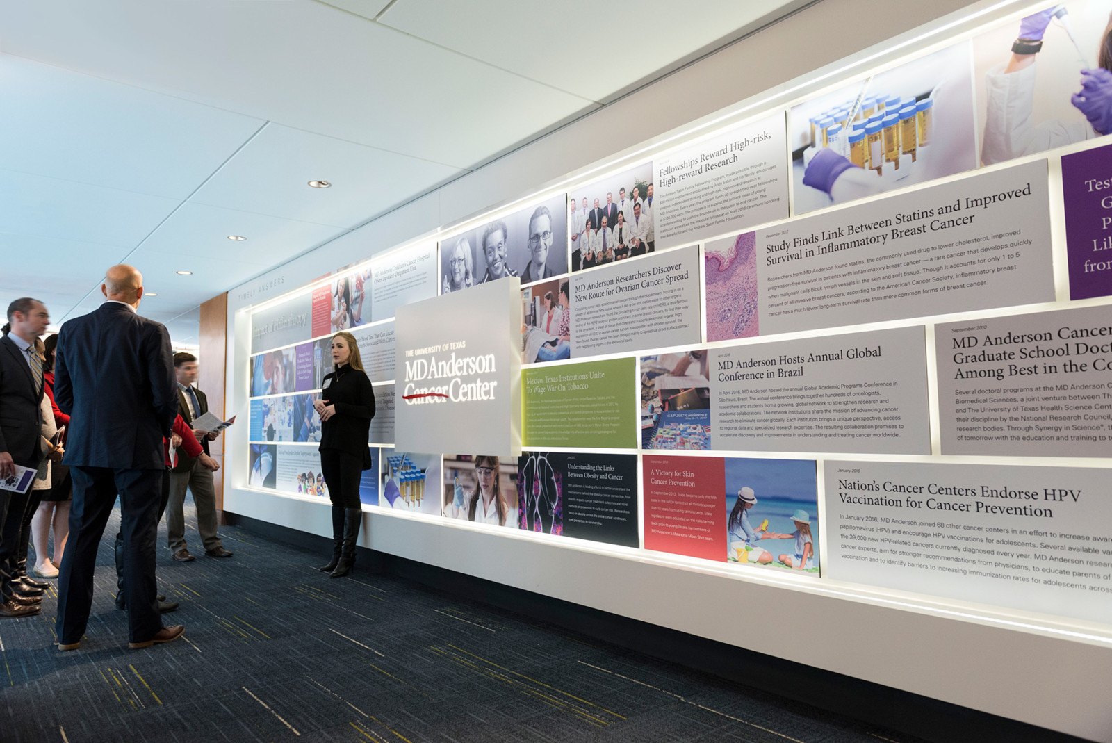 Drawing on MD Anderson’s brand attributes, the team designed a multimedia gallery that communicates stories of the center’s mission to eliminate cancer in Texas, the nation and the world.