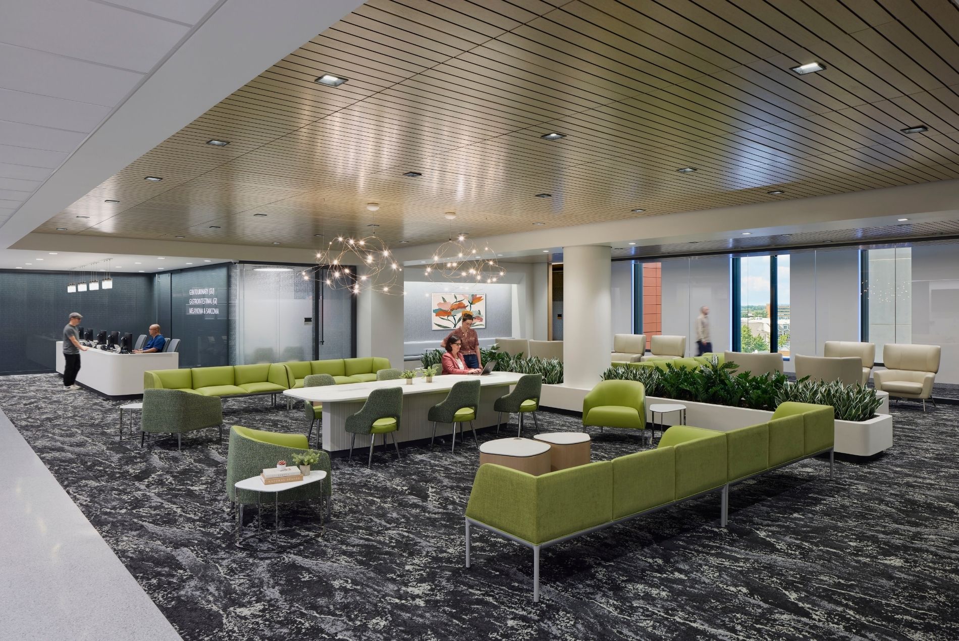 Outpatient services include 88 infusion bays, 80 exam rooms, diagnostic imaging (including an MRI LINAC, one of only 100 worldwide), urgent care, pediatrics and an on-site pharmacy. Wellness amenities include a demonstration kitchen, meditation rooms and a physical therapy gym that extend care beyond treatment. Inpatient floors house 96 private rooms, including ICU-flexible accommodations and a protective environment for transplant patients, alongside a dedicated surgical floor. Tunable lighting supports circadian rhythms, and every patient room delivers 100% outside air. A vibrant “Jersey Shore”-themed environment serves the center’s youngest patients.