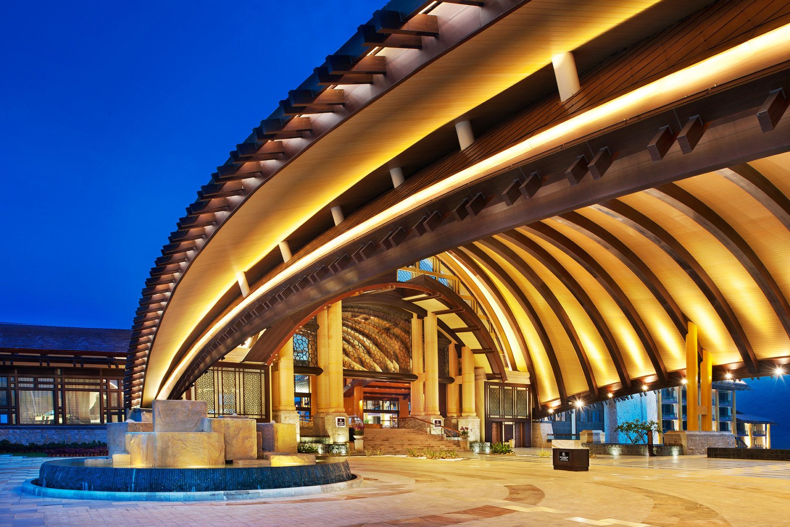 This “twin dragon” concept informed the resort’s distinctive roof forms, which rise from the beachfront to create softly vaulted structures linking the waves and mountains. Large overhangs and grand arched public spaces enable the open-truss structure to bring the dragon forms into the main buildings.